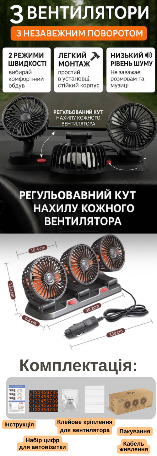 Потрійний вентилятор 3-в-1 — це ідеальне рішення для тих, хто шукає компактне, потужне та гнучке охолодження. Три окремі вентилятори можна повертати незалежно один від одного, що дозволяє спрямовувати повітря в різні сторони одночасно.